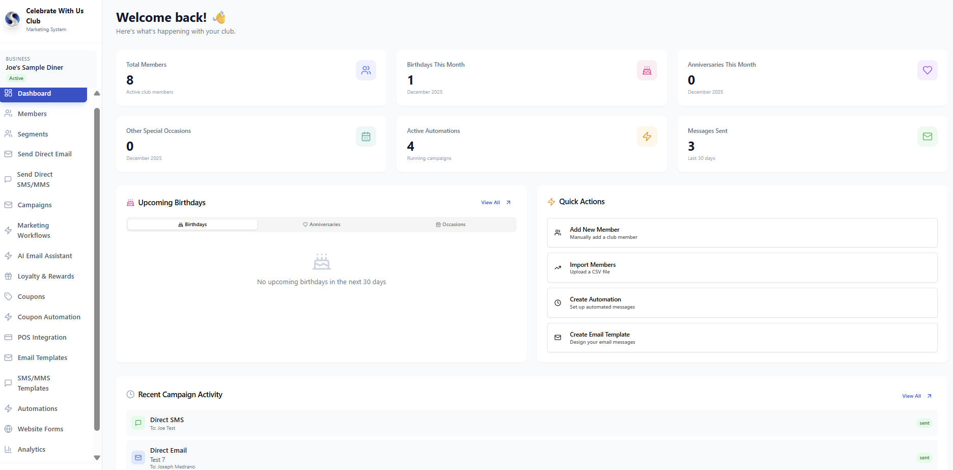 customer loyalty through personalized, automated outreach.Our dashboard gives you full control over birthday and anniversary campaigns, direct messaging, loyalty rewards, and more—all in one place.Easily manage club members, track engagement metrics, and launch high-converting email and SMS automations with just a few clicks.With built-in tools for segmentation, coupon creation, POS integration, and AI-powered email assistance, Celebrate 360™ empowers restaurants, wineries, salons, service providers, and any business looking to engage their customers to deliver timely, heartfelt messages